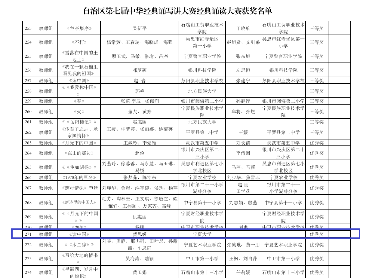近日,由宁夏回族自治区教育厅组织的第七届中华经典诵写讲大赛经典诵读大赛获奖名单正式公示。我院教师贺思媛凭借参赛作品《读中国》,荣获教师组优秀奖,为学院赢得了荣誉。