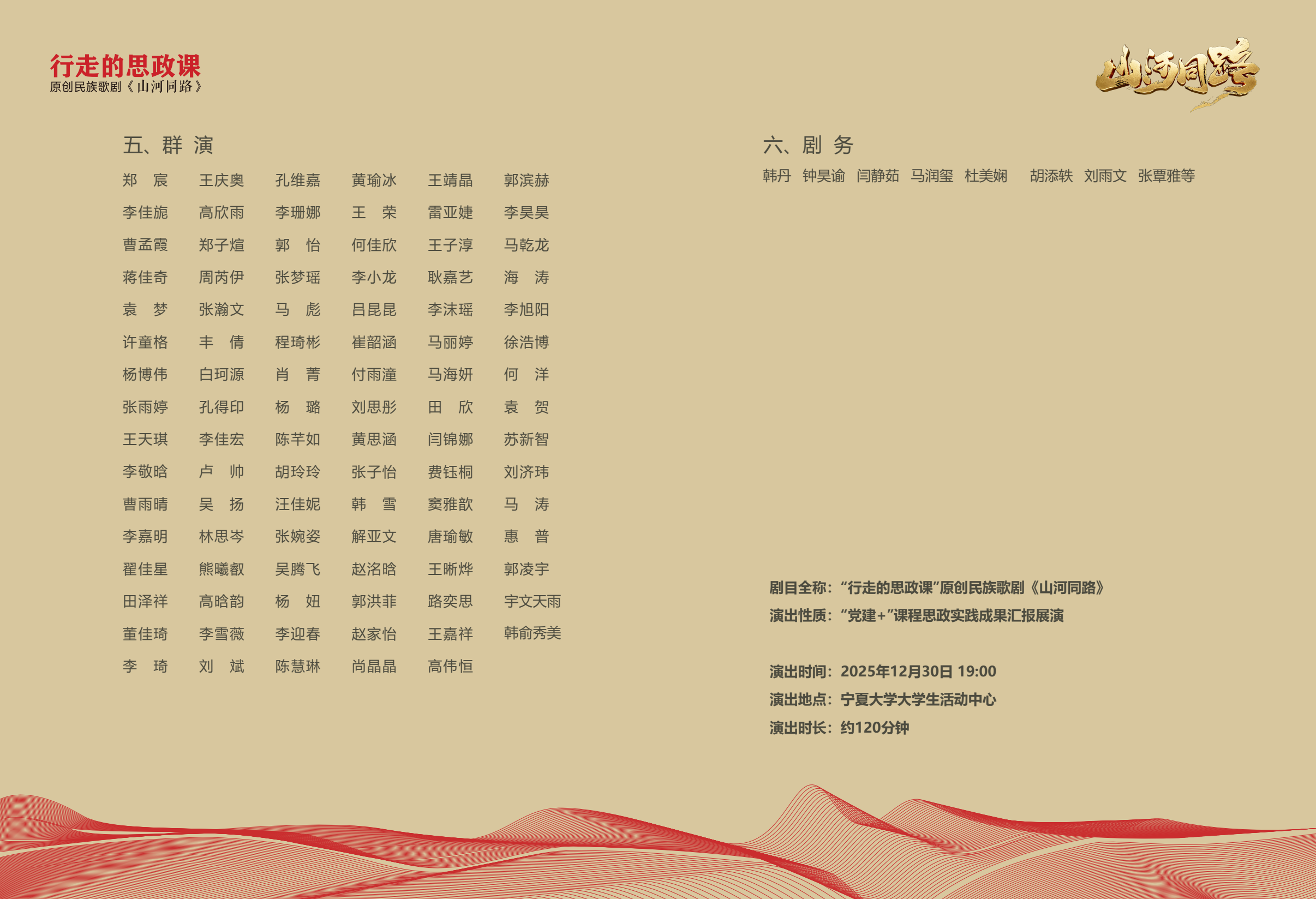由宁夏大学倾力打造的“行走的思政课”原创民族歌剧《山河同路》,将于2025年12月30日19:00在宁夏大学文萃校区大学生活动中心隆重首演。本剧为“党建+”课程思政实践成果汇报展演,以真实事迹为蓝本,用艺术诠释信仰,以歌声接力精神。