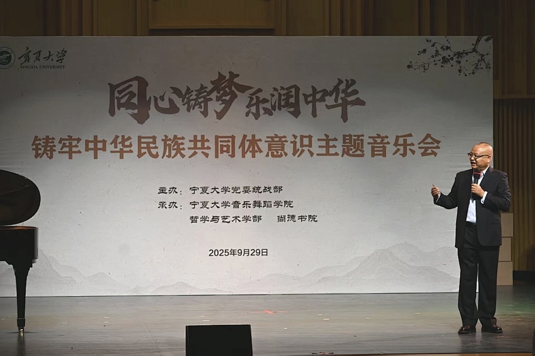 为深入贯彻中央民族工作会议精神,扎实推进民族团结进步教育,9月29日晚,宁夏大学在德艺楼成功举办"同心铸梦 乐润中华"铸牢中华民族共同体意识主题音乐会。校党委副书记韩惠丽,校党委常委、党委统战部部长朱学军等领导出席活动,与全校四百余名师生代表共同观看了这场融艺术性与思想性于一体的音乐盛宴。