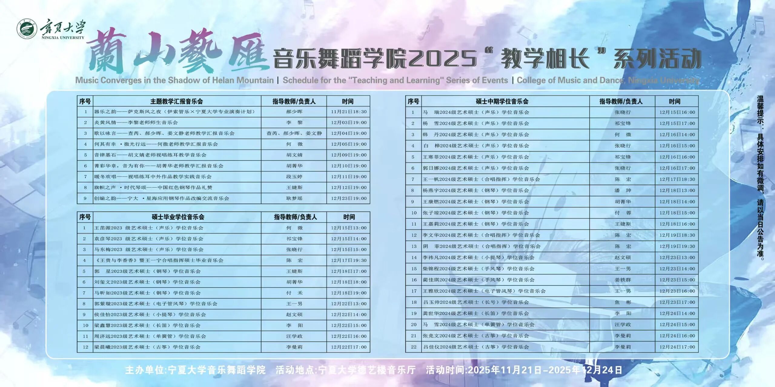 为深入践行新时代美育精神,推动艺术教育高质量发展,宁夏大学音乐舞蹈学院正式创立“兰山艺汇”品牌活动。这不仅是学院艺术实践与交流的长期平台,也是落实“以美育人、以文化人”的重要载体。