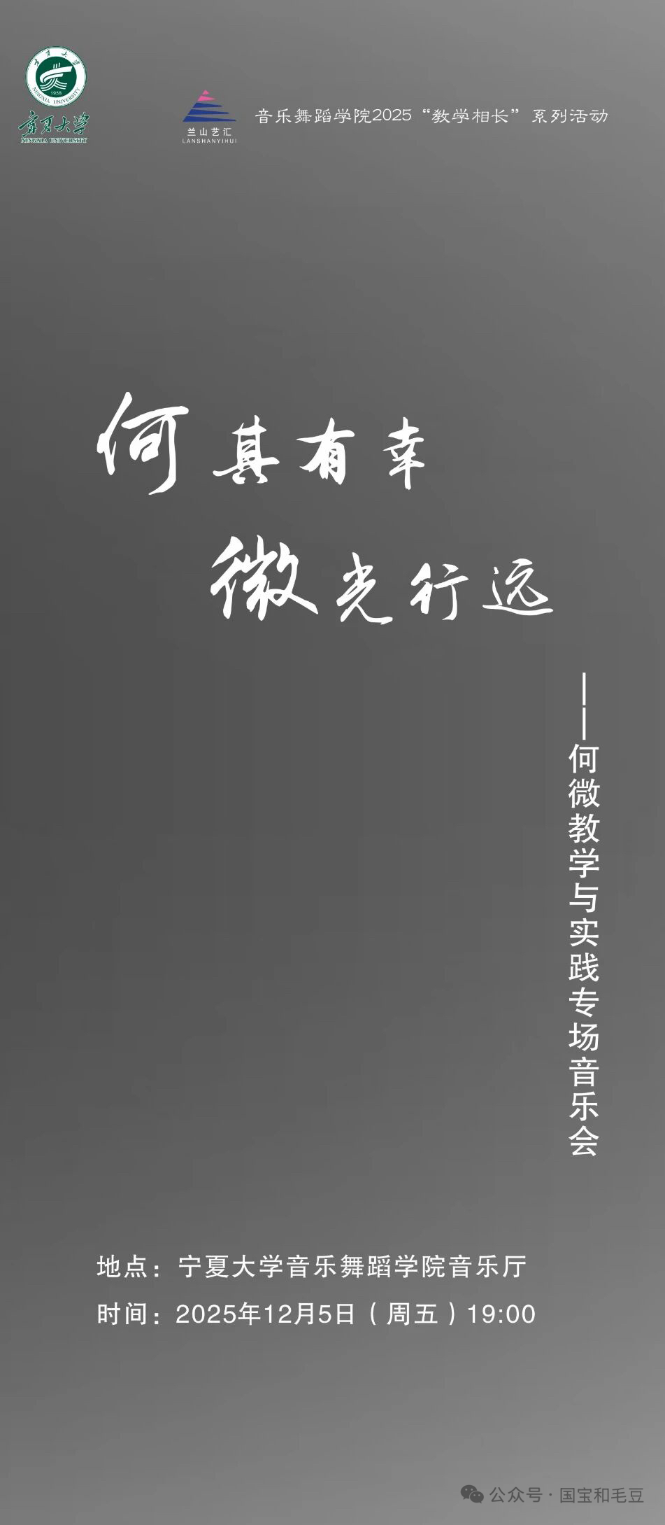 兹定于2025年12月5日(星期五)晚七时,在宁夏大学音乐舞蹈学院音乐厅,举办“何其有幸,微光行远”何微教学与实践专场音乐会。