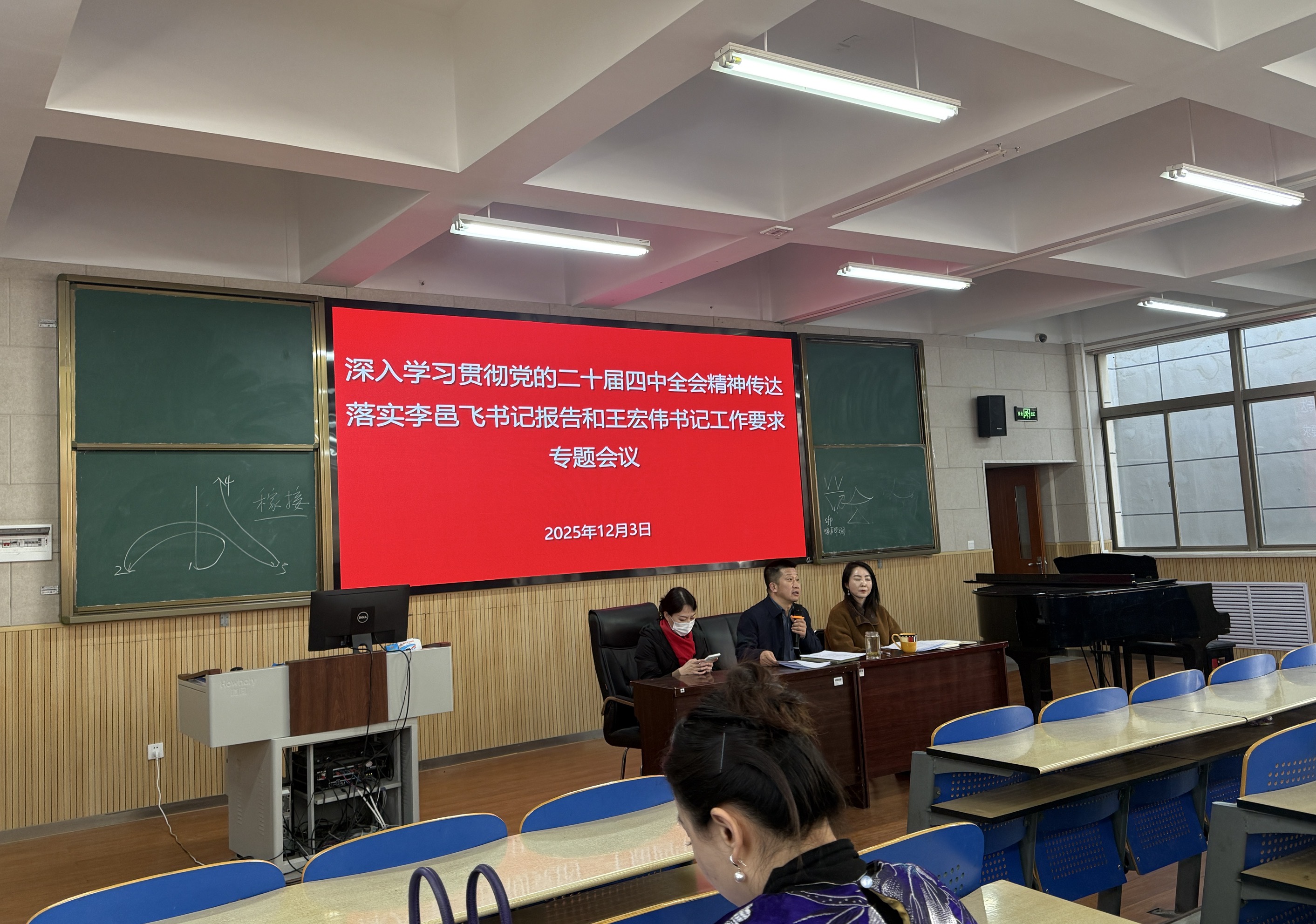 2025年12月3日下午,音乐舞蹈学院召开全院教职工大会,传达学习贯彻自治区党委书记李邑飞同志在宁夏大学调研宣讲时的重要指示精神,以及校党委书记王宏伟同志的相关部署要求,结合实际全面安排校园安全稳定、法治宣传教育与师德师风建设等工作。会议围绕落实立德树人根本任务、推动学院内涵式高质量发展进行深入研讨,进一步统一思想、凝聚共识、明确重点、压实责任,为学院各项事业稳步推进奠定坚实基础。