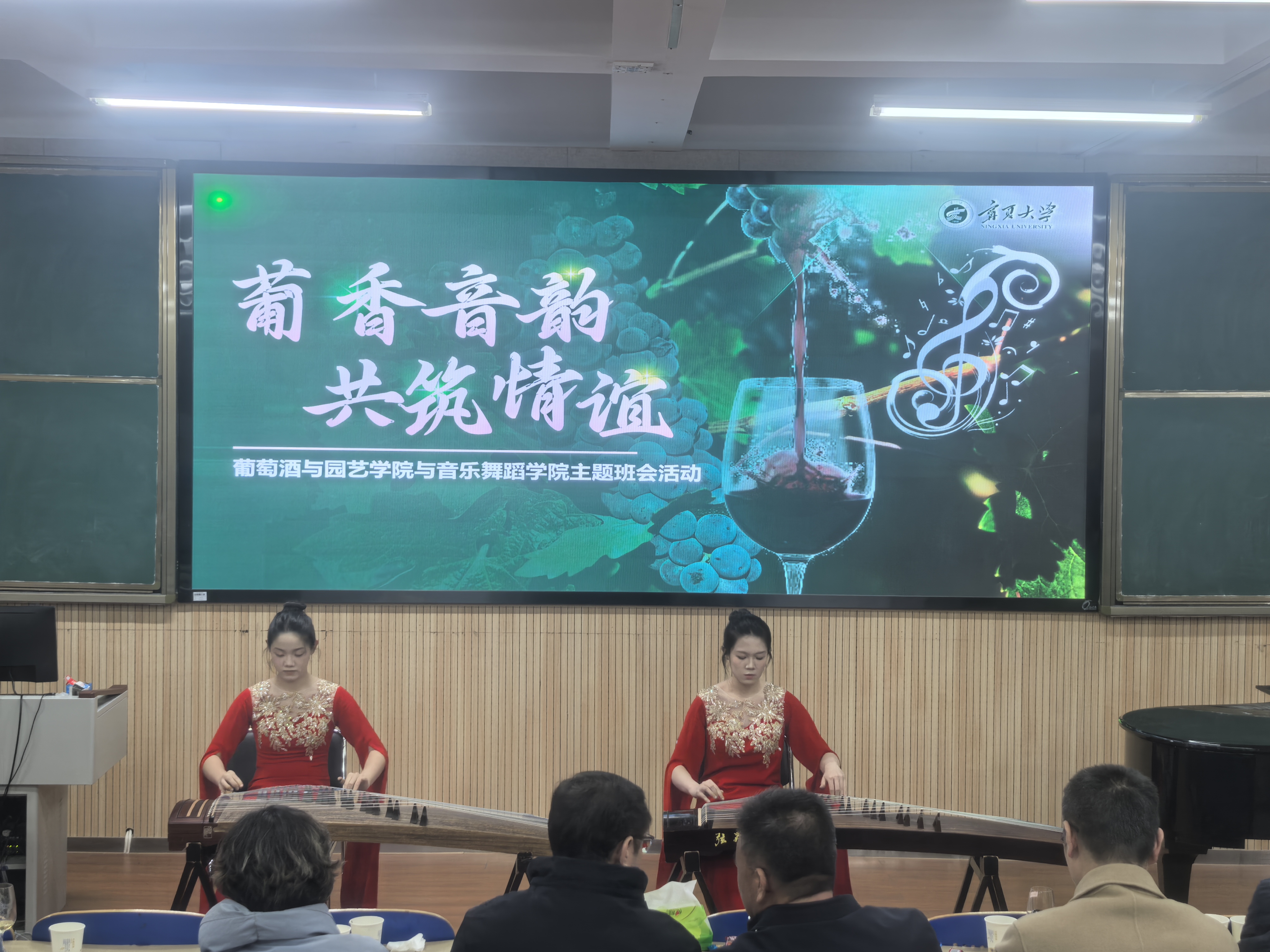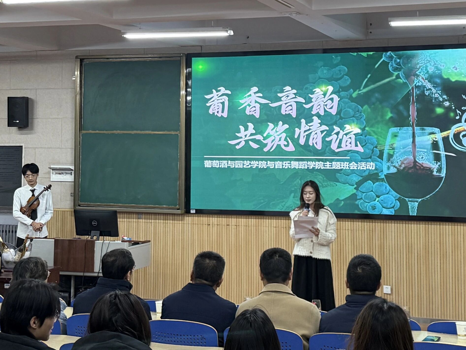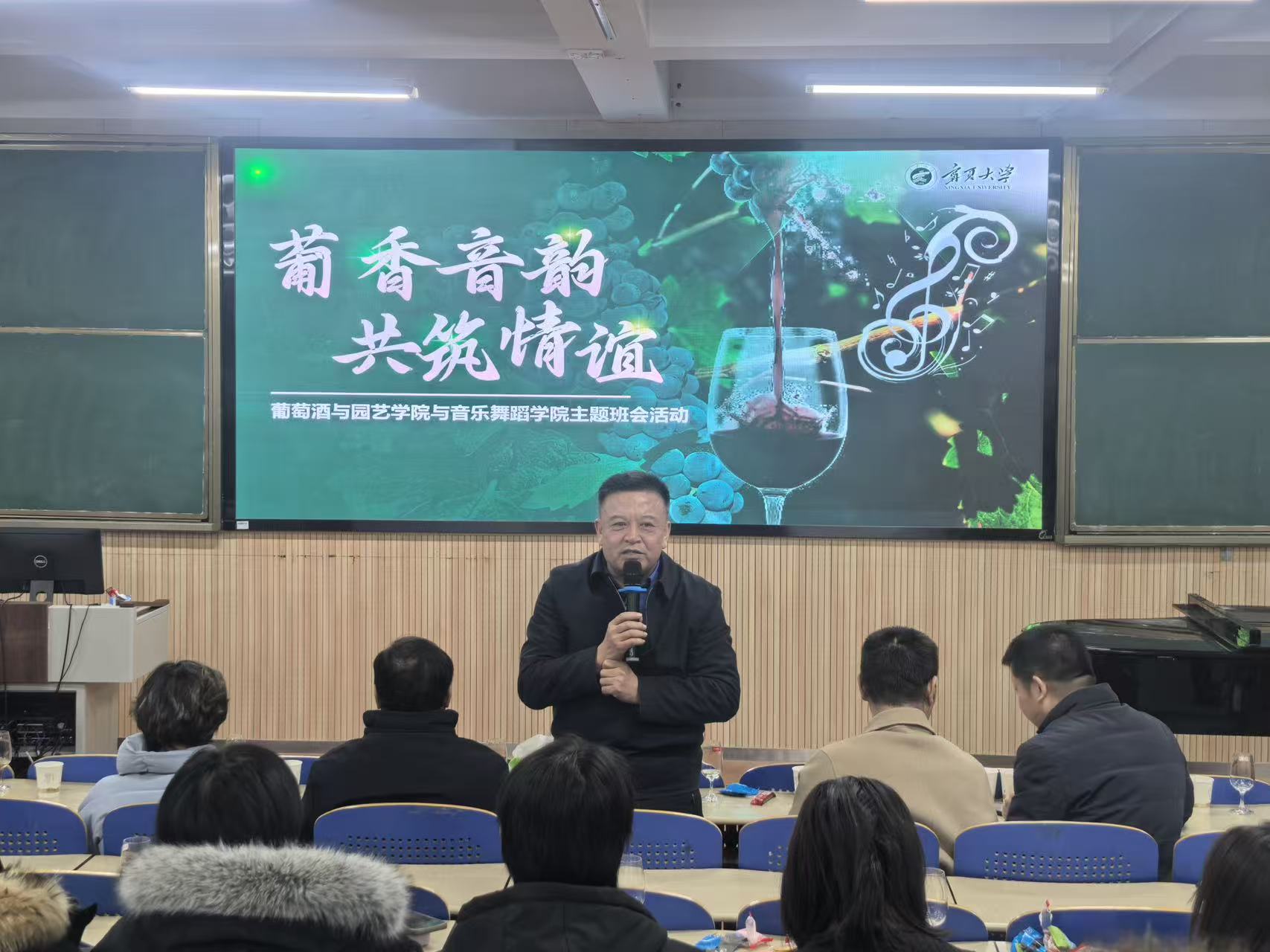 为深入贯彻落实立德树人根本任务,推动领导干部“七进一交友”活动走深走实,2025年12月15日晚,学校党委副书记张桓、纪委书记马元等校院两级领导深入学生班级,参加了由音乐舞蹈学院2024级音乐学专业(1)班与葡萄酒与园艺学院2024级葡萄与葡萄酒工程专业(中外合作办学)联合举办的“葡香音韵,共筑情谊”主题班会。此次活动旨在以专业特色为纽带,促进葡萄酒文化与音乐艺术对话,拓展学生视野,加强学院交流,探索跨学科育人新路径。