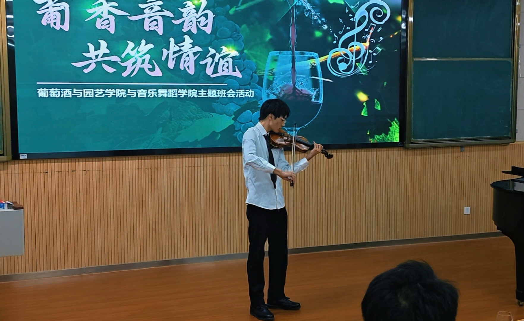 班会在主持人热情洋溢的欢迎辞中开始。当凝结风土智慧的酿造技艺与陶冶心灵的音乐艺术相遇,一场围绕美学、匠心与文化的跨学科对话也随之展开。音乐舞蹈学院学生演绎的巴赫《第一小提琴无伴奏奏鸣曲》第一乐章,以严谨典雅的旋律为活动奠定了高雅基调。