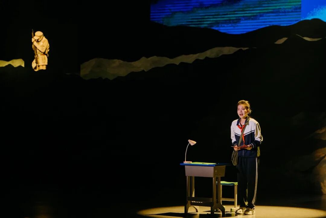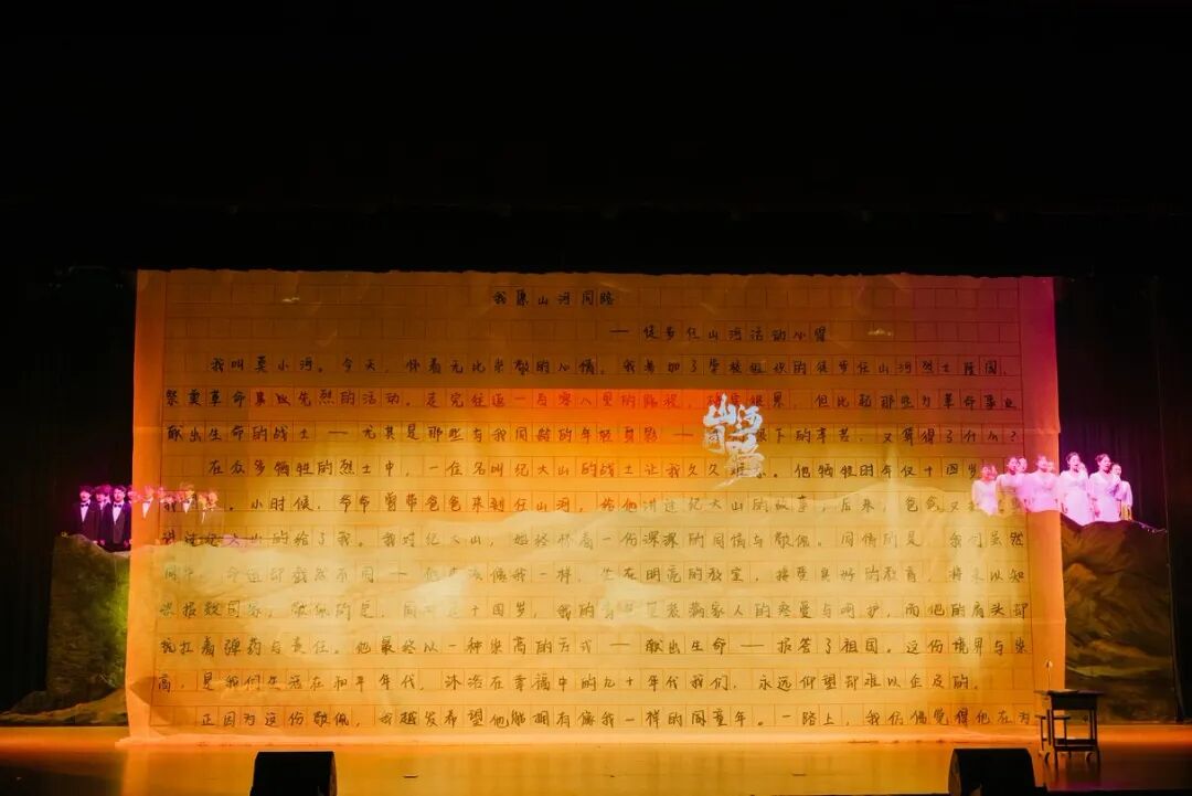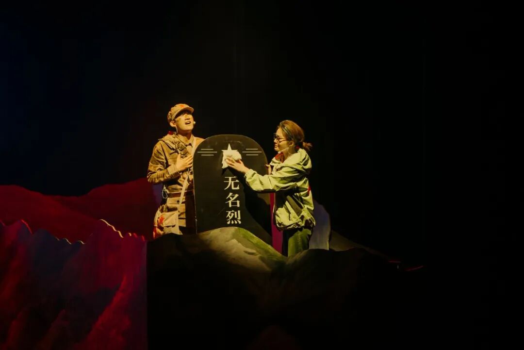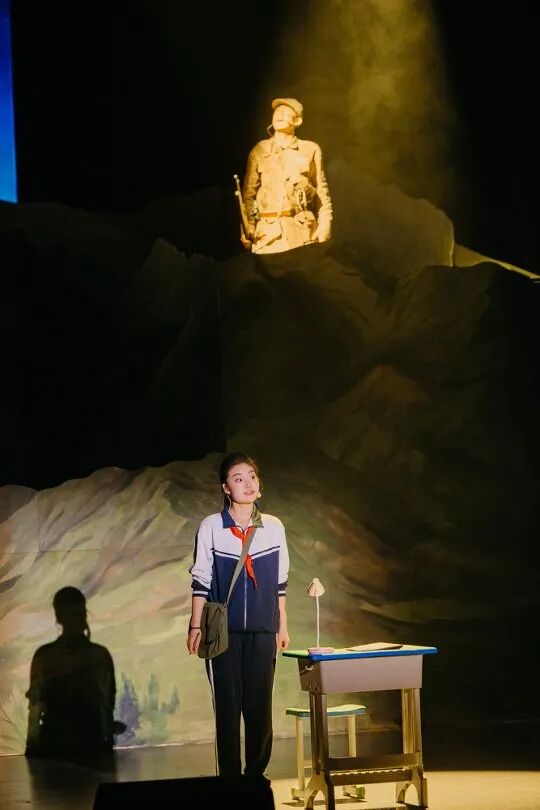 剧目以一篇学生作文为引线,巧妙串联1995年的现实时空与1949年的战争岁月,让新时代学子“莫小河”与解放军小战士“纪大山”实现跨时空的精神相遇。全剧通过“共赴”“生死”“同路”“山河”四幕及尾声“永远的记忆”层层递进:纪大山为徒步师生引路、为守护众人英勇牺牲的瞬间,戳中无数泪点;莫小河长大后成为一名教师,与老校长、现任校长共同带领新一代学子,接续踏上百里祭英烈之路,生动诠释传承的意义;战火记忆与和平现实的交织,让长眠的英烈见证今日国泰民安。舞台上,真挚的表演、动人的旋律与厚重的红色故事相融,再现了革命先烈浴血奋战的峥嵘岁月,也展现了代代学子接力传承的感人场景。