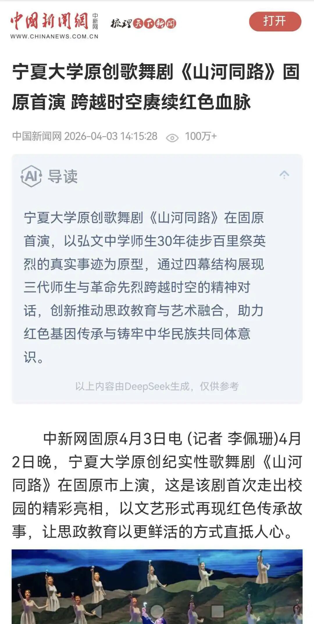 4月2日首演结束后,光明日报、中国新闻网、中国日报网等中央及自治区各级媒体,以文字、视频等多种形式对《山河同路》进行了集中报道。其中,中国新闻网的相关内容上线不到24小时,浏览量便突破百万+,形成现象级传播,极大提升了学校的美誉度与影响力,宣传价值难以估量。目前,该剧在校内外反响强烈,多地、多单位已纷纷发出巡演邀请,期待这部红色佳作走进更多校园与城市。